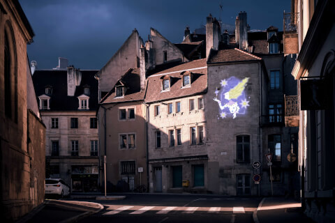 Festival Lueurs de Mantes and Light's festival of Saint Genis Laval - An illuminated art trail through the city "For thousands of years, in Mantes-la-Jolie, the Light has been preparing. It has been hidden in the bricks and blocks that form the walls of your flats, houses, car parks and shopping centres. It has infused itself, condensed in matter, soaking it with its flow as sweet as honey. The Light has waited, day after day, year after year, until one day it will burst forth and flood the human world once again. To do this, it is accompanied by a timeless people: the Scintillons. Their bodies are made of vibrations and dust of pure light. Each Scintillon is unique and embodies a note carrying a message for Humanity. For the Lueurs de Mantes festival, the Light has decided to come out of hiding. With the help of 12 volunteer Scintillons, you'll discover the messages they have to pass on to you." Les Scintillons is a luminous illustrative trail, projected with Gobo.